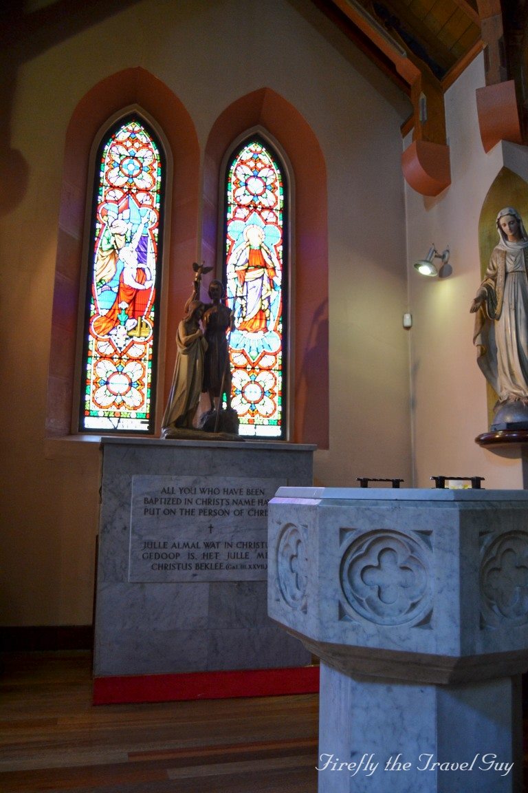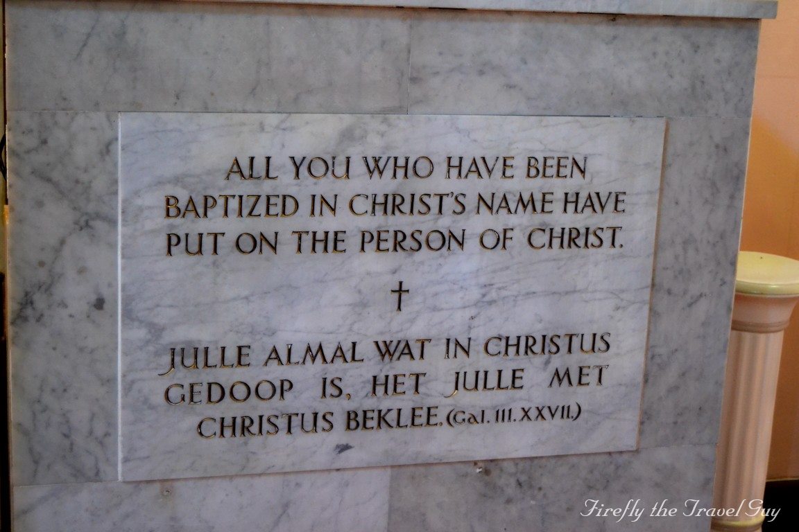 An Afrikaans inscription in a Catholic Cathedral Jonker Fourie - Firefly the Travel Guy Uncategorized November 22, 2017October 9, 2018 1 Minute Imagine my surprise when I found an Afrikaans inscription on a plaque behind the baptismal font in the St Augustine’s Catholic Cathedral. Very unusual. Share this:Tweet Click to share on WhatsApp (Opens in new window) WhatsApp Click to email a link to a friend (Opens in new window) Email Like Loading... Related Published by Jonker Fourie - Firefly the Travel Guy View all posts by Jonker Fourie - Firefly the Travel Guy Published November 22, 2017October 9, 2018