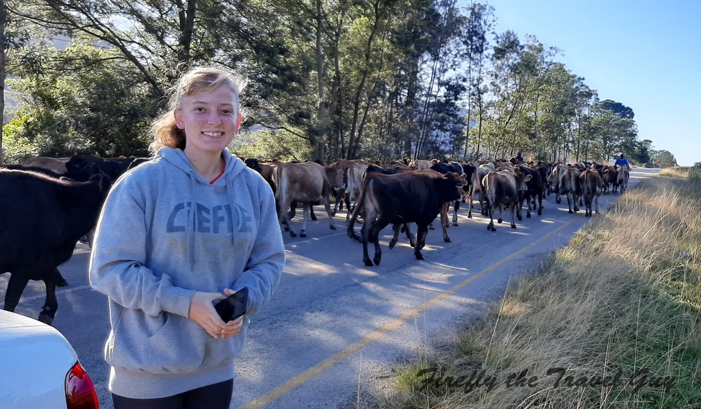 We decided to break away to the Tsitsikamma for the day and rather than just driving in and out on the N2, we took the scenic R102. The three biggest industries in the area are forestry, tourism and dairy so everywhere along the way you pass plantations, dairy farms and accommodation and activity establishments. What we didn’t expect to encounter was a roadblock made up of cattle. As we crested a little hill I realised that there was something in the road about a kilometers ahead. And not something like a car or a person, but a lot of somethings. A herd of cows being moved down the road from one farm to another with the herdsman in front leading the way.