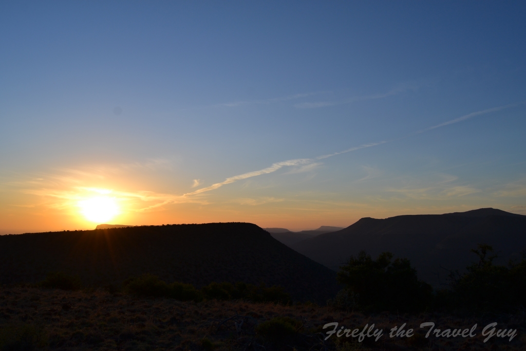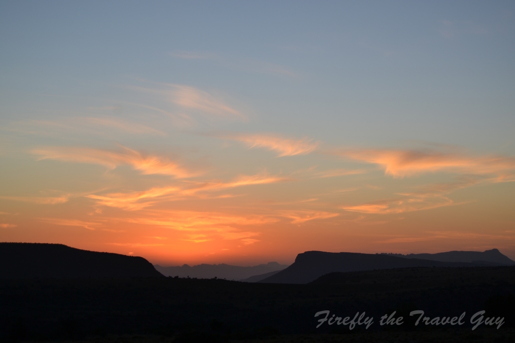 Wide open spaces, a slight breeze, the sound of the veld, the last light as the sun disappears and colours the clouds shades of red, orange and yellow as the sky turns different hues of blue.