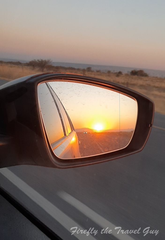 A week or two ago I had to go on an urgent work-related road trip and popped into two of my favorite villages, Nieu-Bethesda and Hogsback, before heading down to East London for the night. It was literally whistle-stop visits with no sightseeing. All business. Barrelling along the N2 between King William’s Town and East London the sun was setting behind me and the best I could do was snap a pic in the car’s side mirror at a hundred and mumble mumble kilometers an hour.