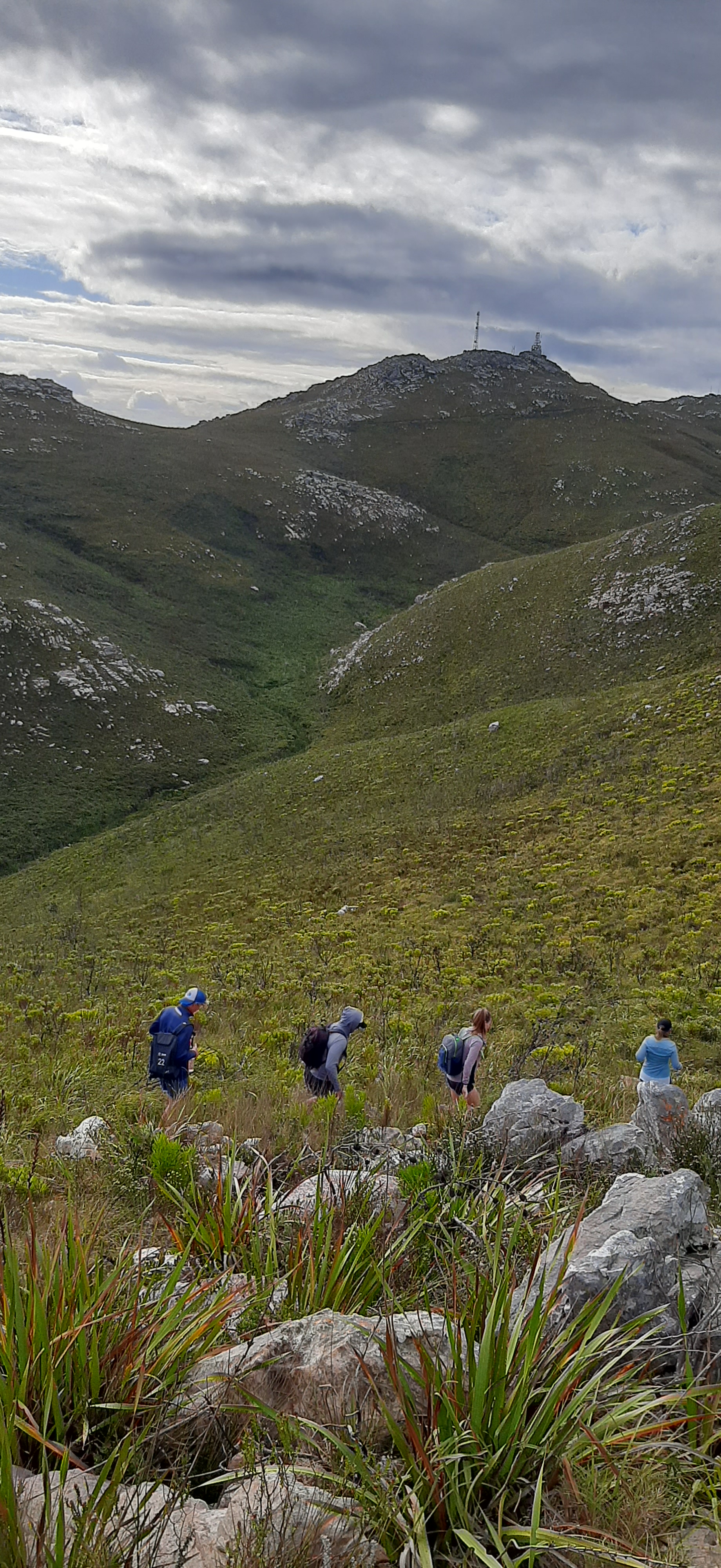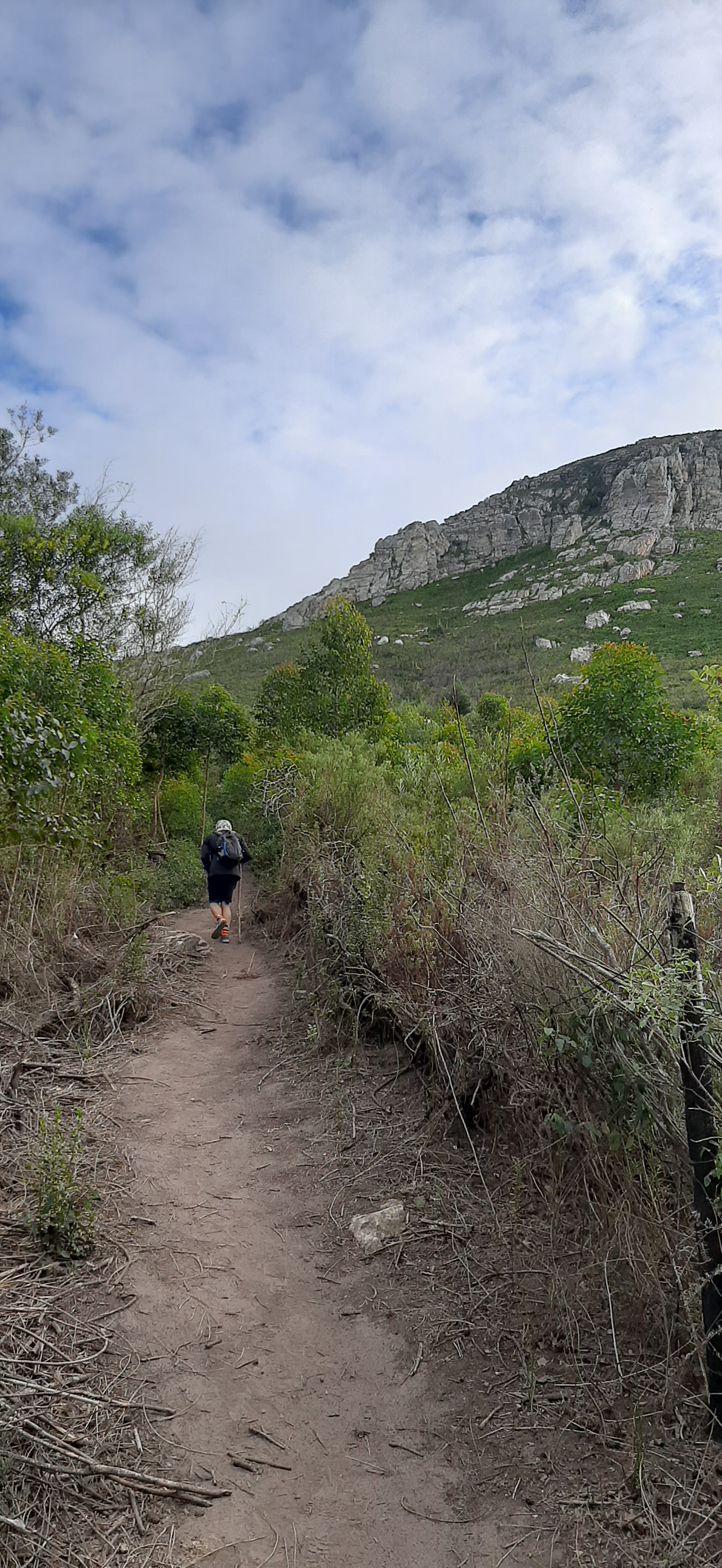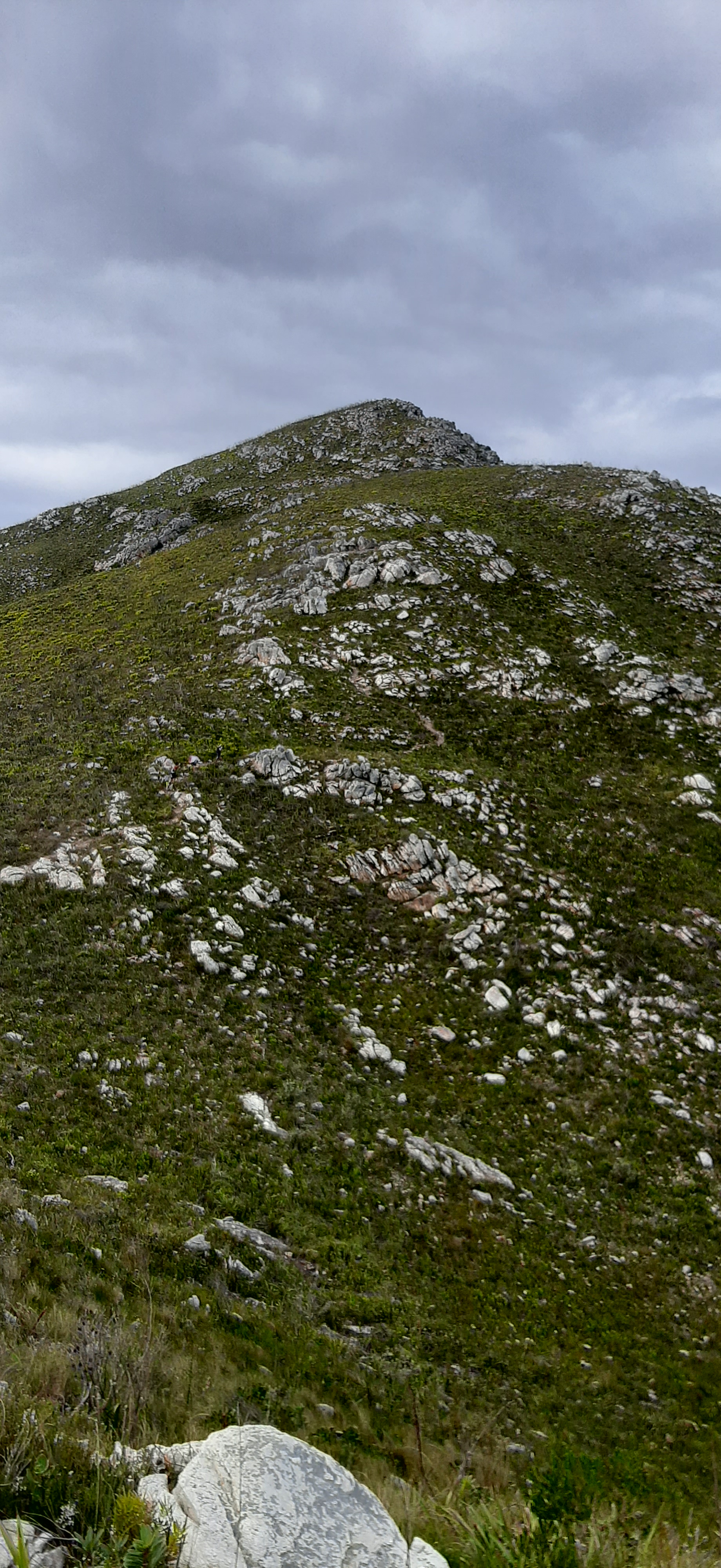 When we got going again the gradient eased for a short while and then the big climb began in earnest as we make our way up a rugged section to the base of the rock cliffs. At this stage the kids went up ahead as the Damselfly and I just weren’t fast enough for their taste. Up to now it felt like we were walking away from the summit, but now we were heading eastward (towards Port Elizabeth) and the summit was waiting for us.