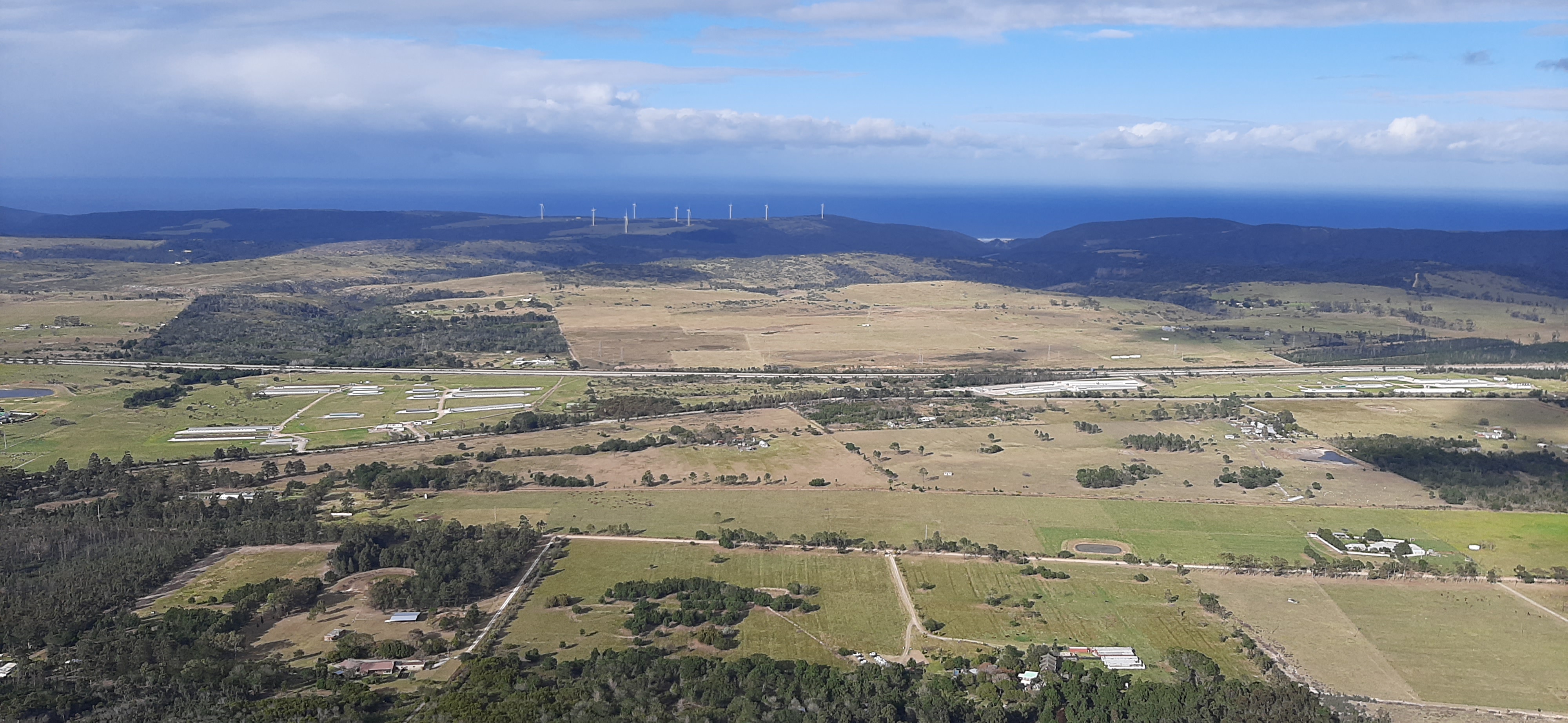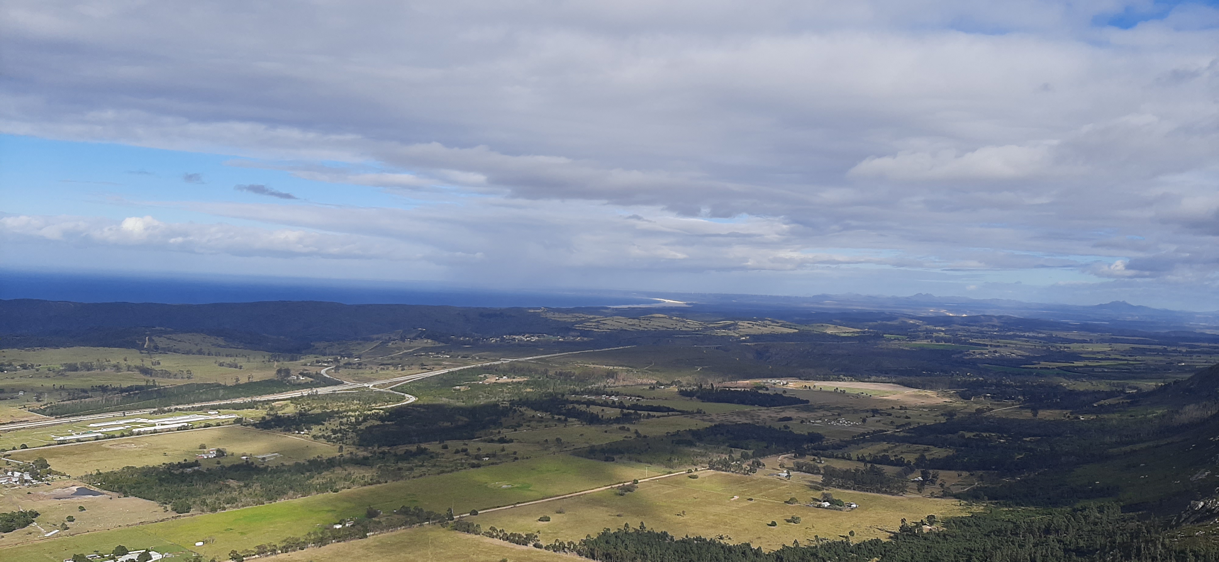 to the south the N2 is visible below, you can see the wind farm at Blue Horizon Bay and Van Stadens Mouth is that bit of white water in the valley, …