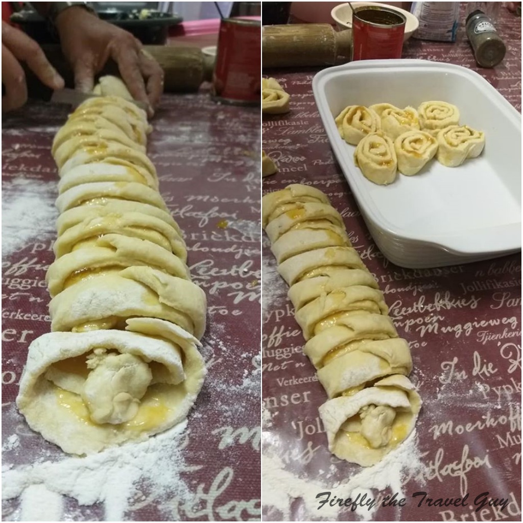 - Pack the slices, cut sides up, closely together, in the greased dish. Scoop the jam which oozed out on the surface you used, and just plonk back on to these rolls.