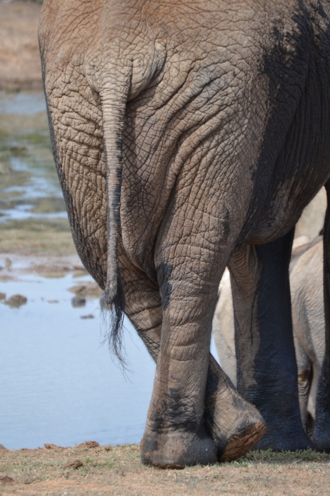 Ellies love to cover themselves in water and mud. You will often see that they arrive at the waterholes in Addo, have a drink and and then start to spray water over their backs or roll around in the water and mud. I have to correct myself though. They don’t literally spray themselves, but rather throw the water from their trunks with a swinging motion.