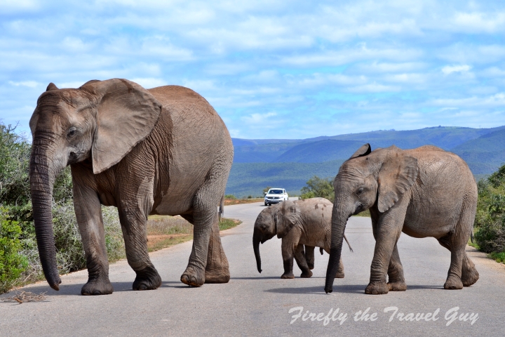 Don’t you just hate a road block? A lady or gent in uniform with a reflector jacket walking around your car and then asking you for your license. Or the “in thing” lately, the burning tires and throwing stones type roadblock. Or the pothole in the road roadblock where you have to wait for cars from the other side to pass before you can drive around it. Then there are the roadblocks you encounter on the roads in the old Transkei part of rural Eastern Cape. They type manned by cows, goats, donkey’s and baster brakke. One roadblock I really don’t mind though is the one you are likely to encounter in Addo Elephant National Park.